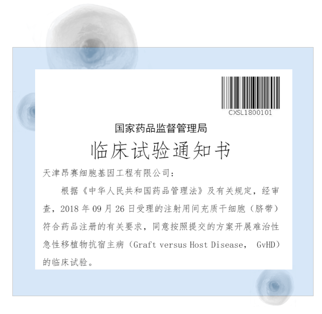 2025年11月3日, 天津昂賽細(xì)胞基因工程有限公司申報(bào)的注射用間充質(zhì)干細(xì)胞(臍帶)治療難治性急性移植物抗宿主病(aGvHD)兒童患者的適應(yīng)癥獲得國(guó)家藥品監(jiān)督管理局臨床試驗(yàn)?zāi)驹S可
